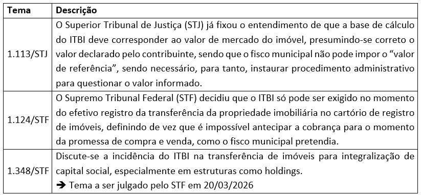 A Reforma Tributária sobre o consumo trouxe os novos tributos IBS, CBS e IS, mas também acabou alterando outros tributos já existentes, dentre eles, o Imposto sobre a Transmissão de Bens Imóveis (ITBI), imposto de competência municipal cobrado nas operações de compra e venda de imóveis, alterando-o principalmente no que se refere à forma de apuração de sua base de cálculo. Sobre o ITBI, há as seguintes discussões em andamento junto ao Poder Judiciário: